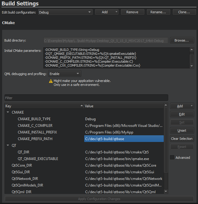 Configuring medium-sized to large CMake projects in Qt Creator can be a challenge due to the number of options that you need to pass to CMake to configure the project correctly. Qt Creator creates an initial configuration for you based on the kit settings and displays it in the Initial CMake parameters field.