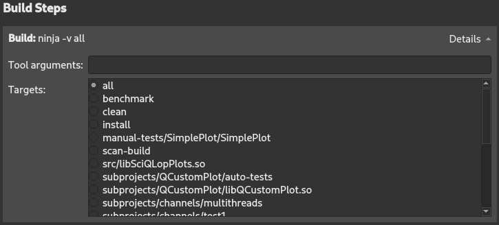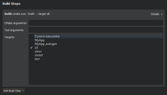 You can add arguments to pass to CMake and the generator and targets for the build command in Build Steps .