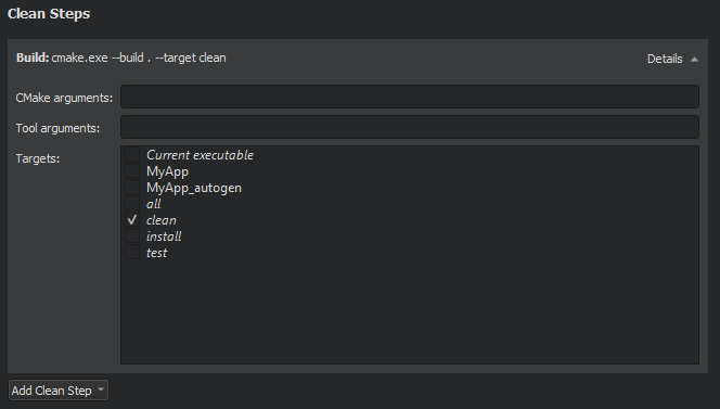 When building with CMake, you can add arguments to pass to CMake and the generator and targets for the clean command in Clean Steps .