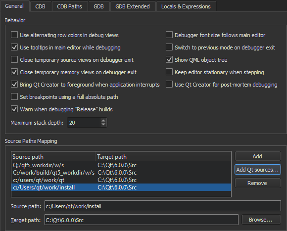 To automatically map the source paths to a Qt version that has not been patched, select Add Qt Sources and browse to the location of the Qt source files.