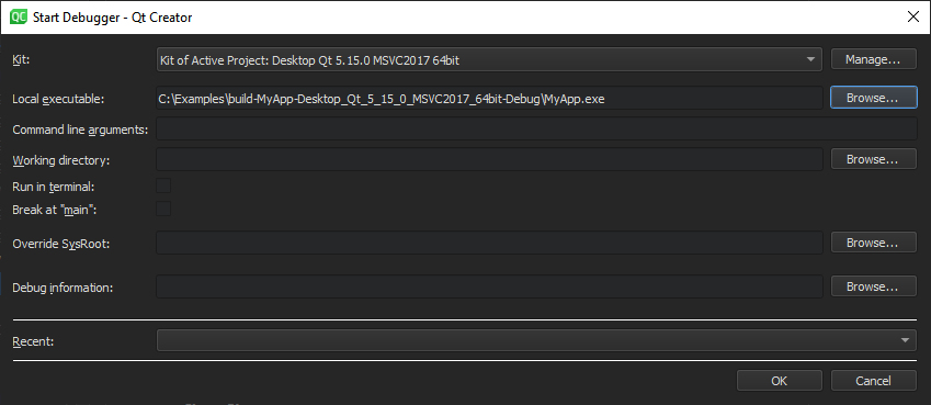 When using GDB or CDB as debug backend, you can specify additional commands to execute before and after the backend and debugged program are started or attached in 工具 > Options > Debugger > GDB and CDB 。更多信息,见 Specifying Debugger Settings .