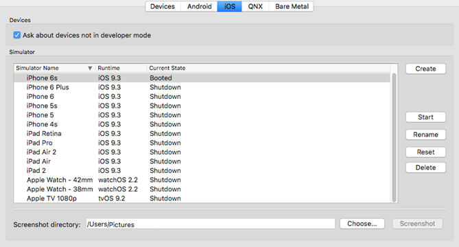 To take screenshots of the simulator, select Preferences > Devices > iOS > Screenshot . The screenshots are stored in the directory specified in the Screenshot directory field.