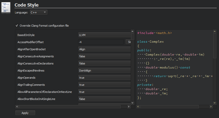 The Clang Format plugin uses the LibFormat library for automatic formatting and indentation.