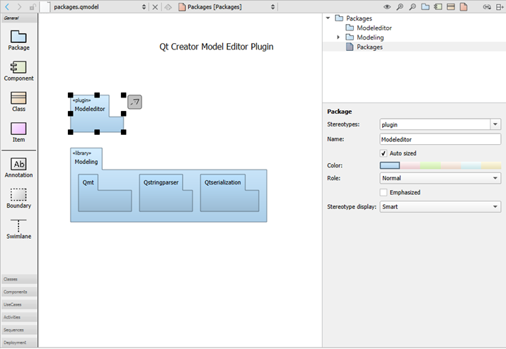 Classes or other objects that you lay on packages are moved with the packages. You can move individual elements and modify their properties (5) by selecting them. You can also use multiselection to group elements temporarily.