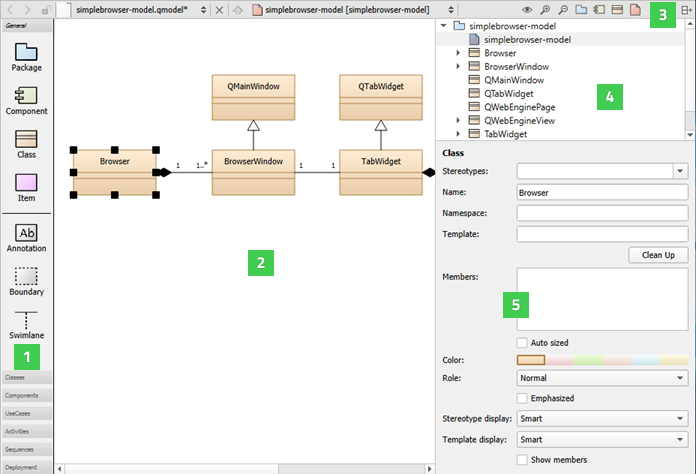 For more information about the available options, see standard.def 在 share/qtcreator/modeleditor directory in the Qt Creator installation directory. It describes also how to define custom relation types and templates for existing types (such as a composition relation that can be drawn between classes).