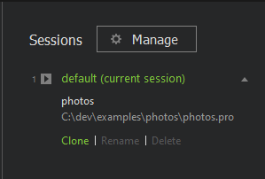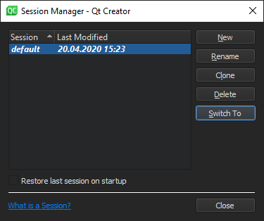 For example, if you work on a project and need to switch to another project for a while, you can clone the current session to save it under a name and create a new session for the other project. Everything that you open after switching to the new session becomes a part of it. When you want to return to working on the first project, switch to the saved session. Qt Creator opens the projects and files that belong to the session.
