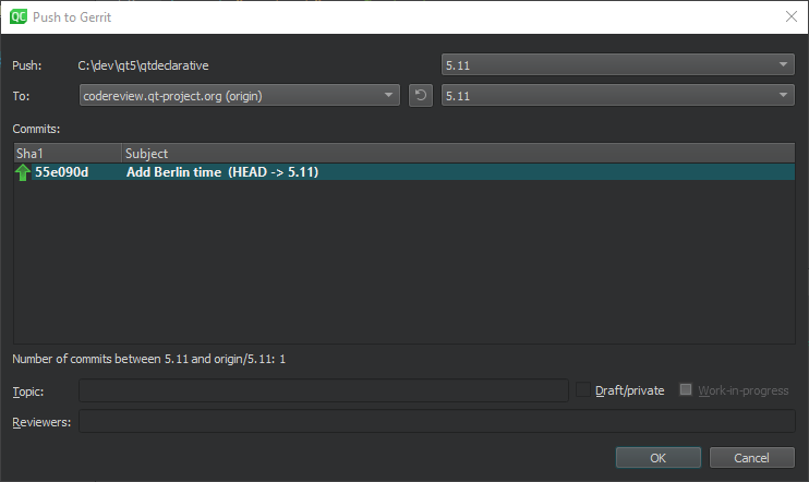 Select the Draft/private check box to push changes that are only visible to you and the reviewers. If you are using Gerrit 2.15 or later, you can select the Work-in-progress check box to push changes that do not generate email notifications.