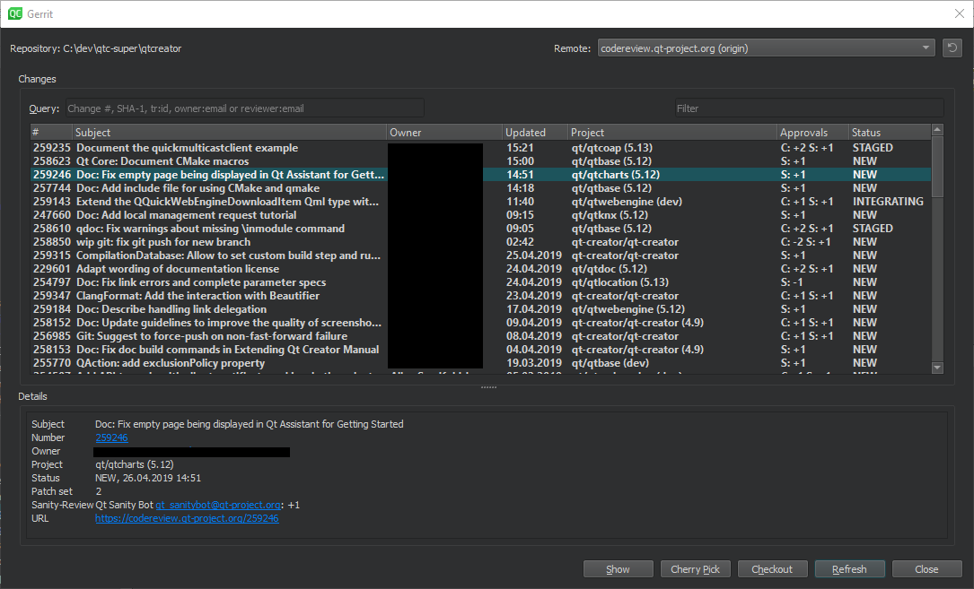 If your Git project uses Gerrit for code reviews, you can view your changes in Qt Creator.