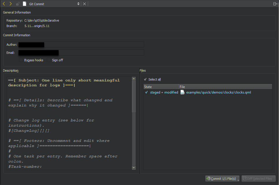 To submit your changes to Git, select Commit . Qt Creator displays a commit page containing a text editor where you can enter your commit message and a checkable list of modified files to be included.